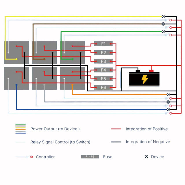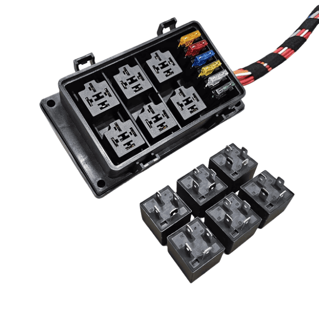 RB6-W is a universal relay and fuse center that can be connected to an ECU or switch to easily control consumers such as: